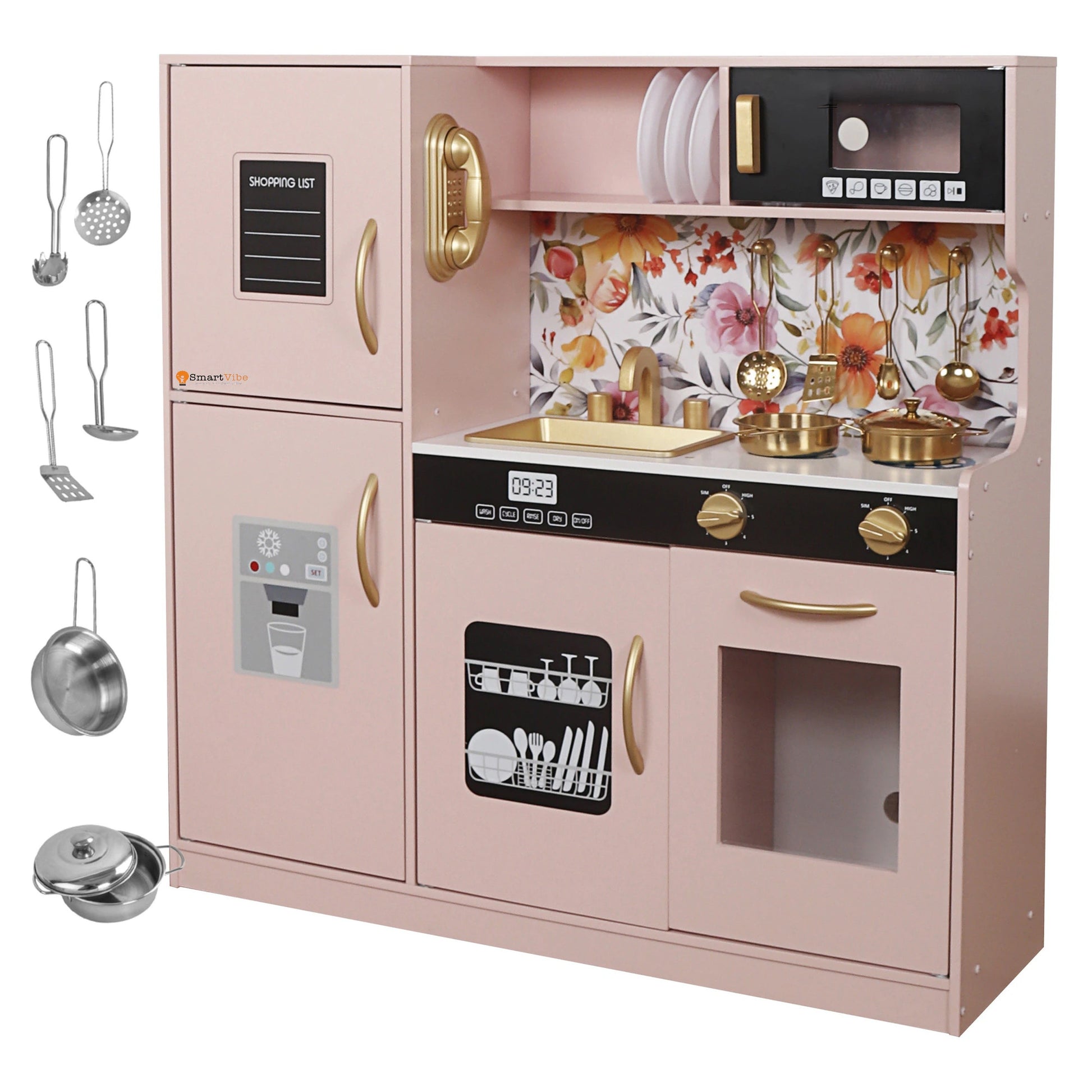 Set Bucatarie pentru Copii din Lemn Natural, FrenchCuisine PINK KIDO, Iluminare LED si Sunete, Elemente Detasabile, Set Ustensile, Cuptor cu Butoane, Telefon, Plita, Microunde, Chiuveta, 80.5 CM Inaltime, PINK KIDO